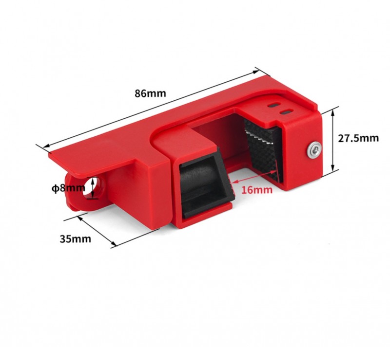 Блокиратор широких автоматических выключателей типа Grip Tight BD-D18-1, подходит для большинства типов электроавтоматов большого размера. Фиксация происходит за счет рифленных зажимов из пластика, регулируемых колесиком с накаткой. Подходит для навешивания одного замка, с диаметром дужки не более 7,5 мм.